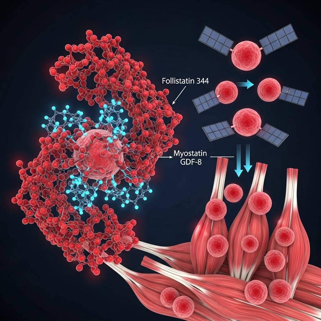 Glicoproteína que inibe miostatina e activina, promovendo crescimento muscular e redução de gordura corporal.