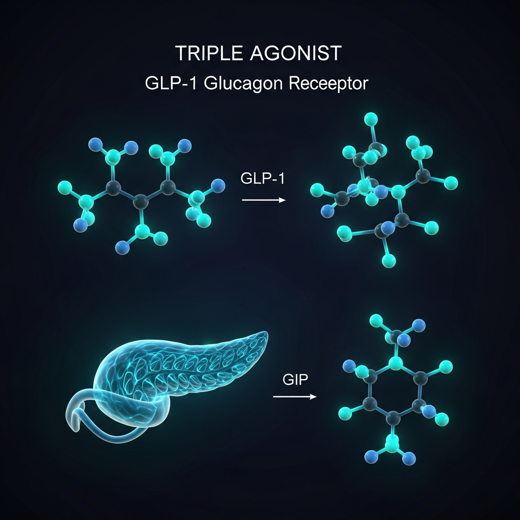 Agonista triplo dos receptores GLP-1, GIP e glucagon (GCGR). A ação GLP-1 reduz apetite e retarda esvaziamento gástrico; a ação GIP potencializa a secreção de insulina e melhora sensibilidade tecidual; a ação GCGR aumenta o gasto energético basal e mobiliza gordura hepática. O efeito combinado resulta em redução de apetite + maior queima calórica + melhor controle glicêmico, com preservação de massa muscular quando combinado com treino e proteína adequada.
