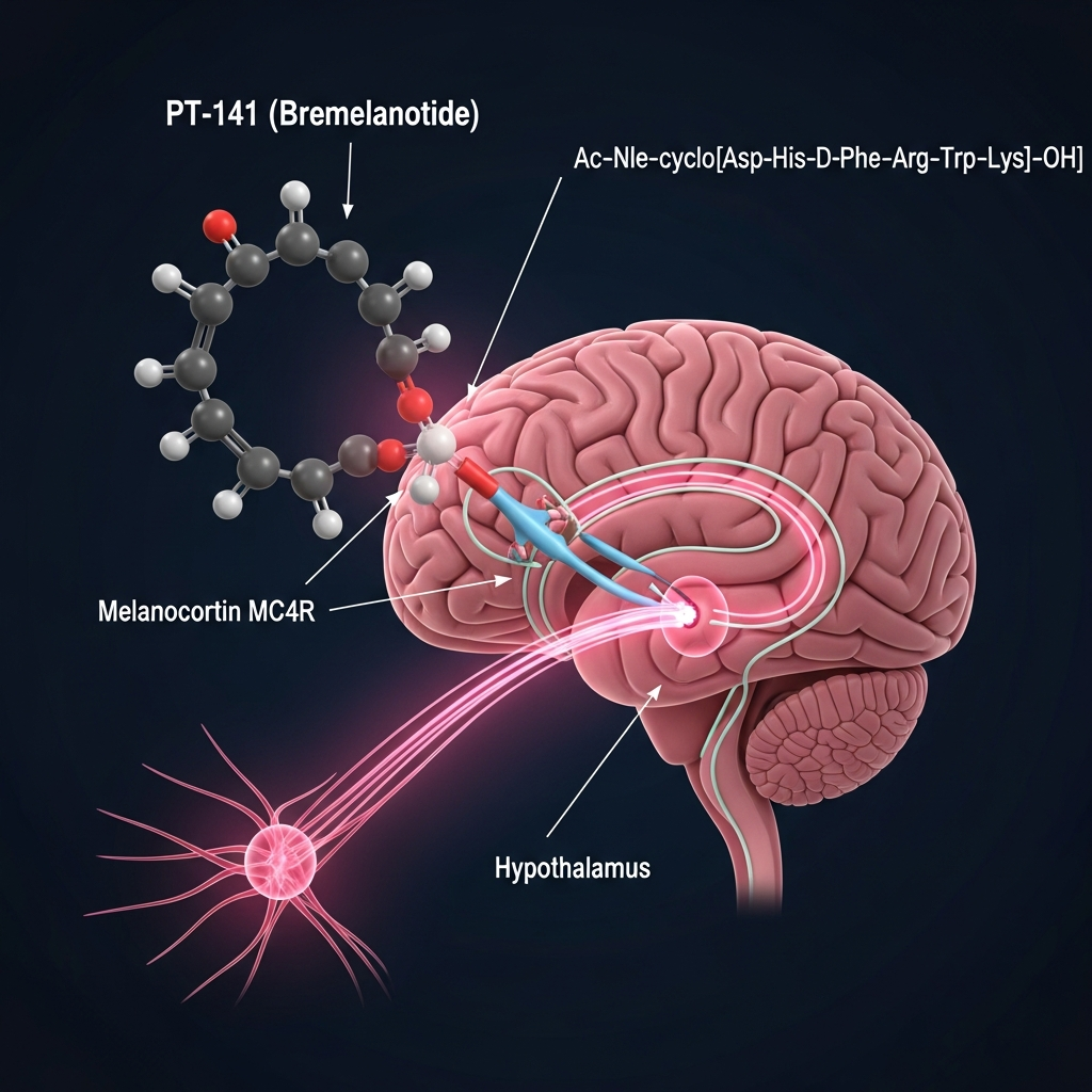 Análogo sintético da alfa-MSH que atua via receptores de melanocortina (MC1R, MC3R, MC4R) no sistema nervoso central. Diferente dos inibidores de PDE5 (Viagra, Cialis), o PT-141 age diretamente no cérebro para estimular o desejo sexual, independentemente do fluxo sanguíneo periférico.