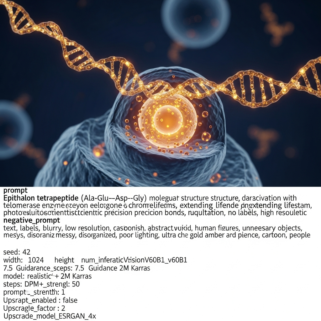 Tetrapeptídeo (Ala-Glu-Asp-Gly) derivado da glândula pineal. Ativa a telomerase — enzima que protege os telômeros, componentes essenciais para a replicação celular saudável. Também regula a produção de melatonina, normaliza o ciclo circadiano e possui propriedades antioxidantes.