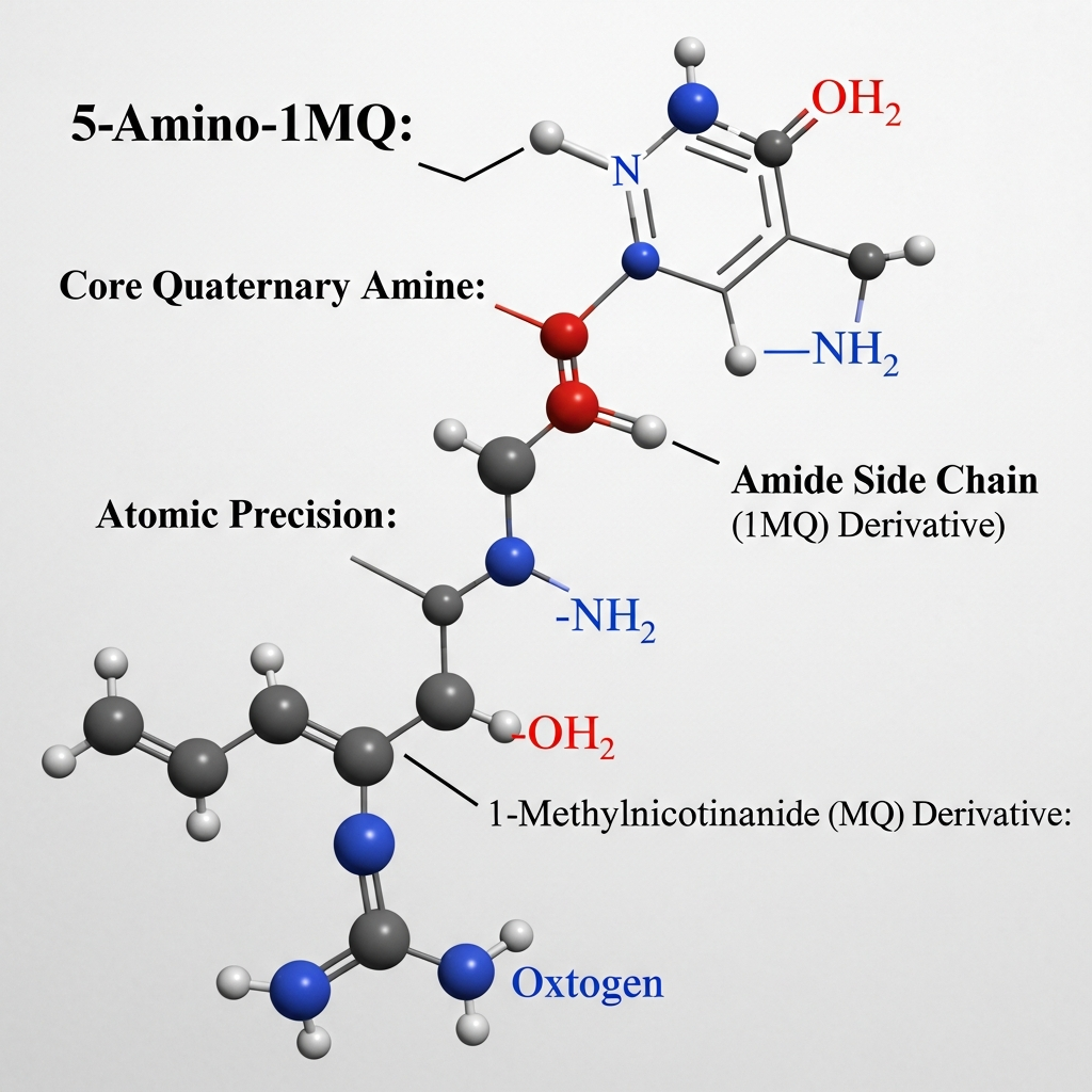 Derivado de metilquinolínio que inibe seletivamente a NNMT (Nicotinamida N-Metiltransferase). Ao inibir a NNMT, restaura níveis de NAD+ e ativa as vias SIRT1 e AMPK. Reprograma adipócitos brancos em fenótipo 'bege' metabolicamente ativo — converte células de armazenamento em células de queima de gordura.