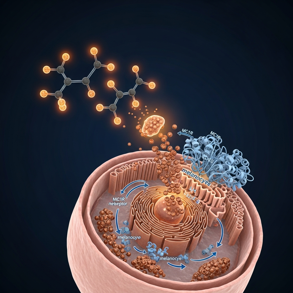 Agonista de receptores MC1R em melanócitos → produção de eumelanina. Menor atividade no MC4R que Melanotan II → menos efeitos sexuais.