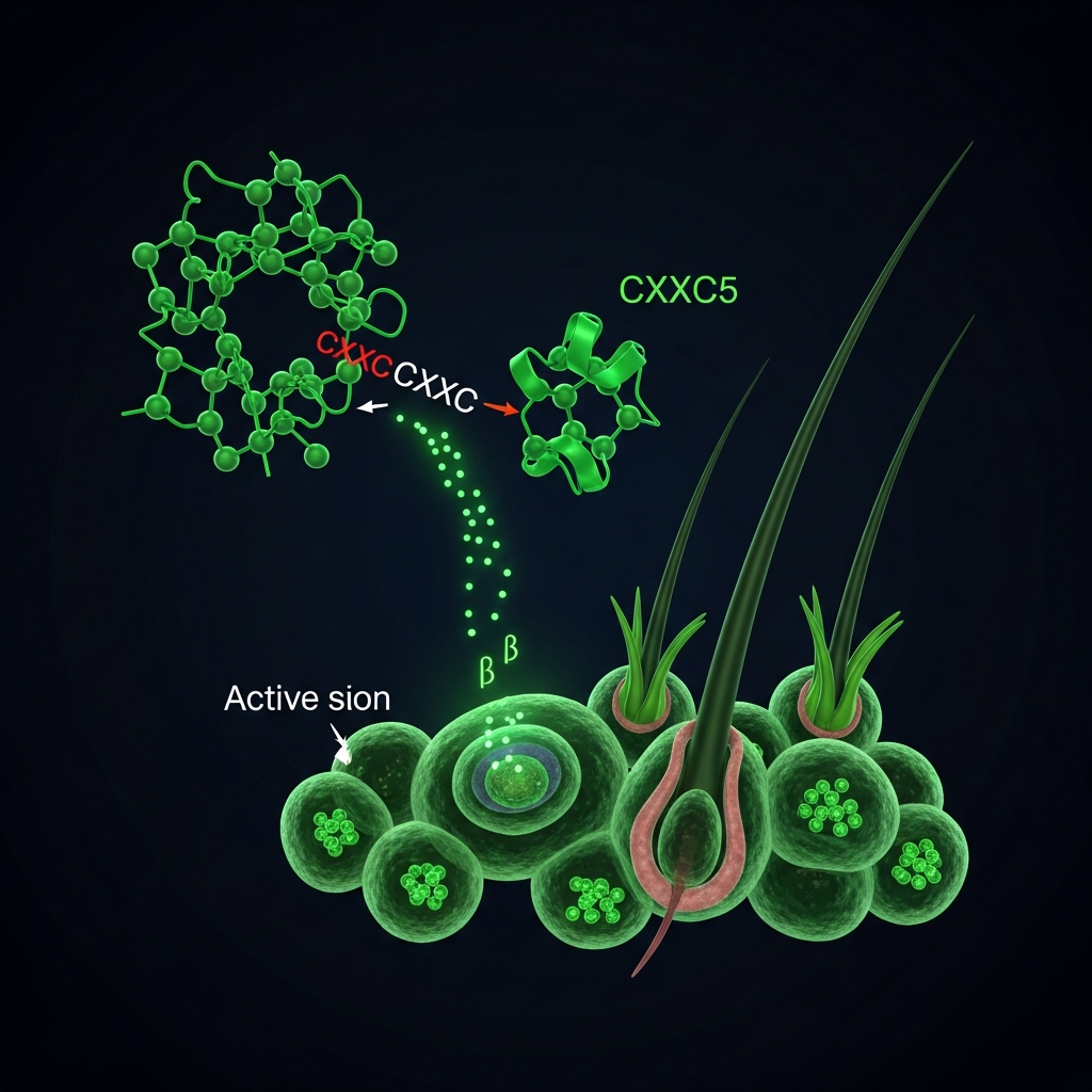 Penetra células da papila dérmica e inibe CXXC5, restaurando sinalização Wnt/β-catenina nos folículos pilosos para promover fase anágena.