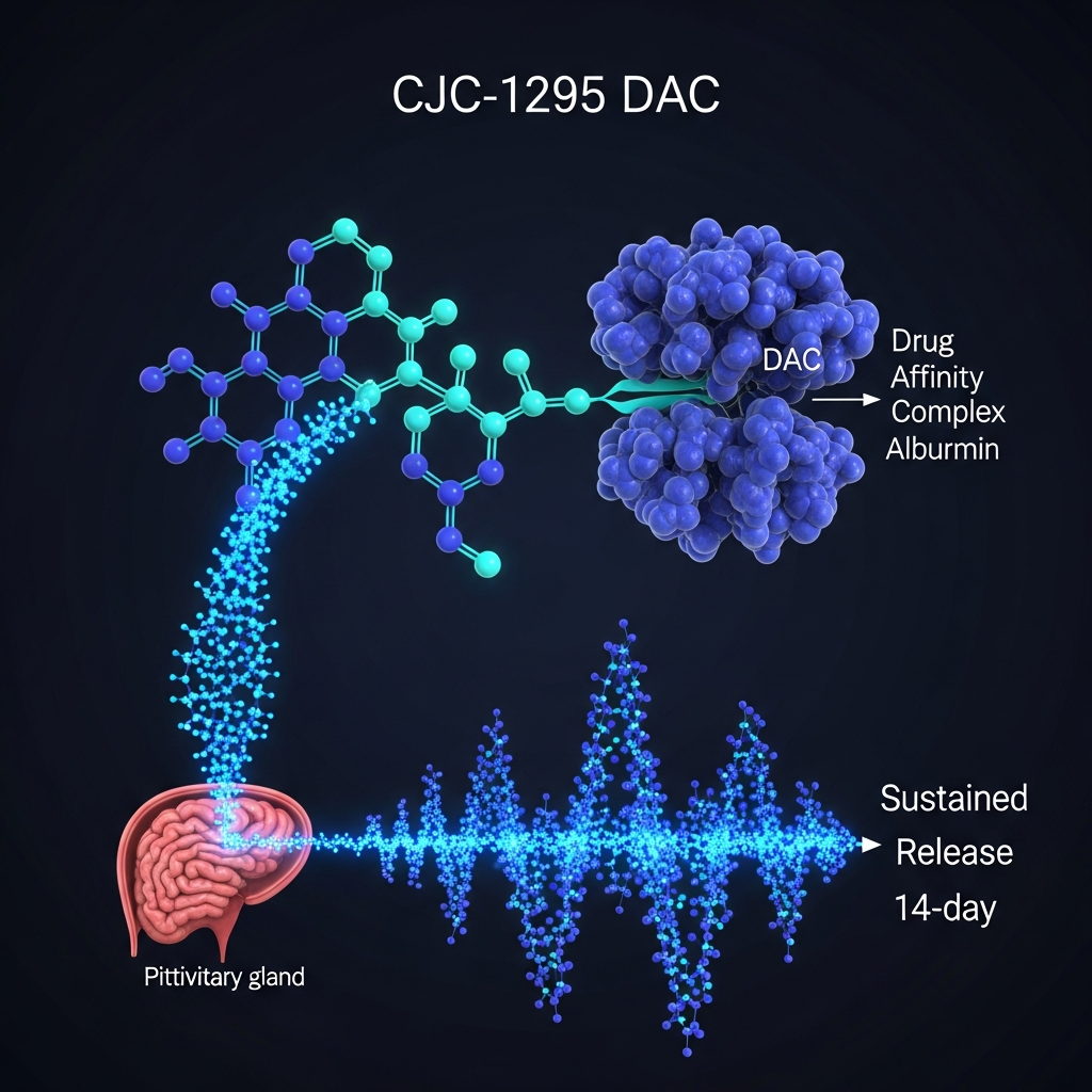Análogo sintético de longa duração do GHRH (Growth Hormone Releasing Hormone) com tecnologia DAC (Drug Affinity Complex). Liga-se covalentemente à albumina sérica, estendendo sua meia-vida para até 8 dias. Promove estímulo constante e sustentado da liberação de GH, mantendo níveis fisiologicamente elevados de GH e IGF-1.
