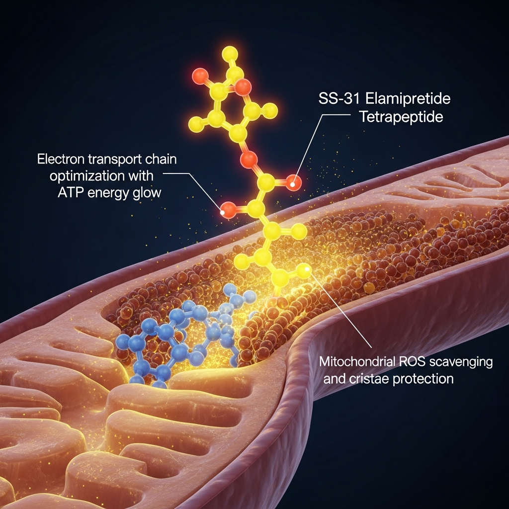 Tetrapeptídeo mitocôndrio-dirigido que protege contra disfunção mitocondrial. Promissor em insuficiência cardíaca, isquemia-reperfusão e doenças mitocondriais.