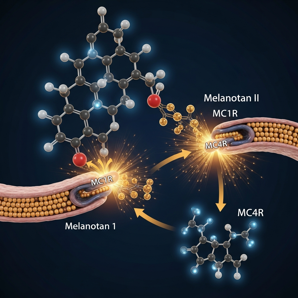 Agonista não seletivo dos receptores de melanocortina MC1R, MC3R, MC4R e MC5R. A ligação ao MC1R estimula melanócitos a produzir eumelanina (melanina escura), escurecendo a pele progressivamente. A ação em MC4R no hipotálamo suprime o apetite e pode aumentar a libido. Meia-vida curta (1-2h) mas com efeitos pigmentares duradouros. Requer cautela por potencial mitogênico em nevos melanocíticos.
